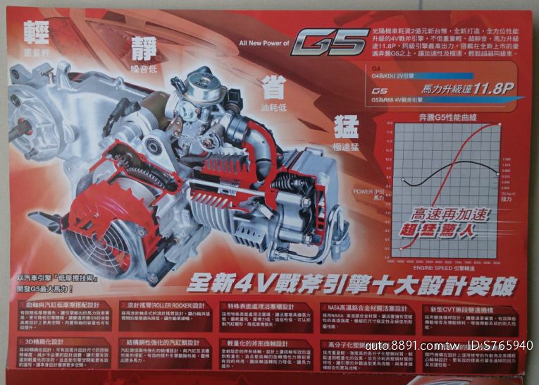 光陽G5,乃全方位性能升級的4V戰斧引擎,重量輕、超靜音,馬力升級達11.8P ,同級引擎最高出力,讓加速及極速,輕鬆超越同級車。